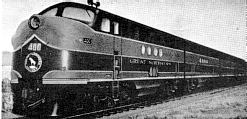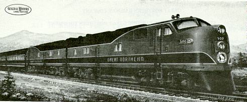 Page TenQuick link to GNR Color Chips ![]() 4000 H.P. DIESEL PASSENGER LOCOMOTIVE Designed and Built For THE GREAT NORTHERN RAILWAY COMPANY By Electro-Motive Division * General Motors * La Grange, Illinois This diesel passenger locomotive consists of two lead units. Each unit is equipped with two General Motors 12 cylinder, V-type, 2-cycle Diesel engines having a bore of 8 1/2 inches, stroke 10 inches and a unit fuel injection system. These engines are rated at 1000 HP each at 800 RPM, providing a total of 4000 HP for the locomotives. Each engine is directly coupled to a DC generator. Current from these generators is fed through control apparatus to four traction motors - two to each truck - and geared directly to the driving axles. Two six-wheel trucks are used in each of these units for smoother operation in the upper high-speed range, middle wheels being designed to aid in weight distribution only. SPECIFICATIONS: Dimensions: Overall length over couplers: 142'-2 1/2" Maximum width over grab irons: 10'-6 7/8" Width over body posts: 9'-10" Height overall above rails: 14'-10" Wheel diameter: 36" Rigid wheel base of trucks: 14'-1" Roller bearing journals: 6 1/2"-12" Truck swing designed for 21 degree curve or 274-foot radius Distance between truck centers (each unit): 43'-0" Supplies: Fuel oil: 2400 gals. Sand: 32 cu. ft. Lubricating oil: 560 gals. Engine cooling water: 600 gals. Boiler water: 2400 gals. Weights: Total weight fully loaded: 634,240 lbs. Weight with one half of variable supplies: 613,500 lbs. Maximum tractive effort at rim of driving wheels at 25% adhesion: 103,380 lbs. ![]() The Great Northern Railway was first of the northern transcontinentals to utilize 5400 HP Diesel freight locomotives, built by Electro-Motive Division of General Motors. A large fleet of these and 6000 HP diesels transport freight faster over mountain territory.