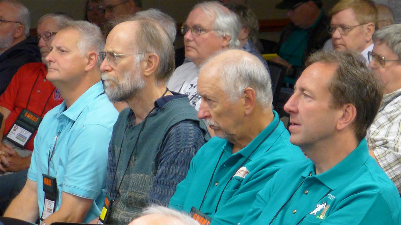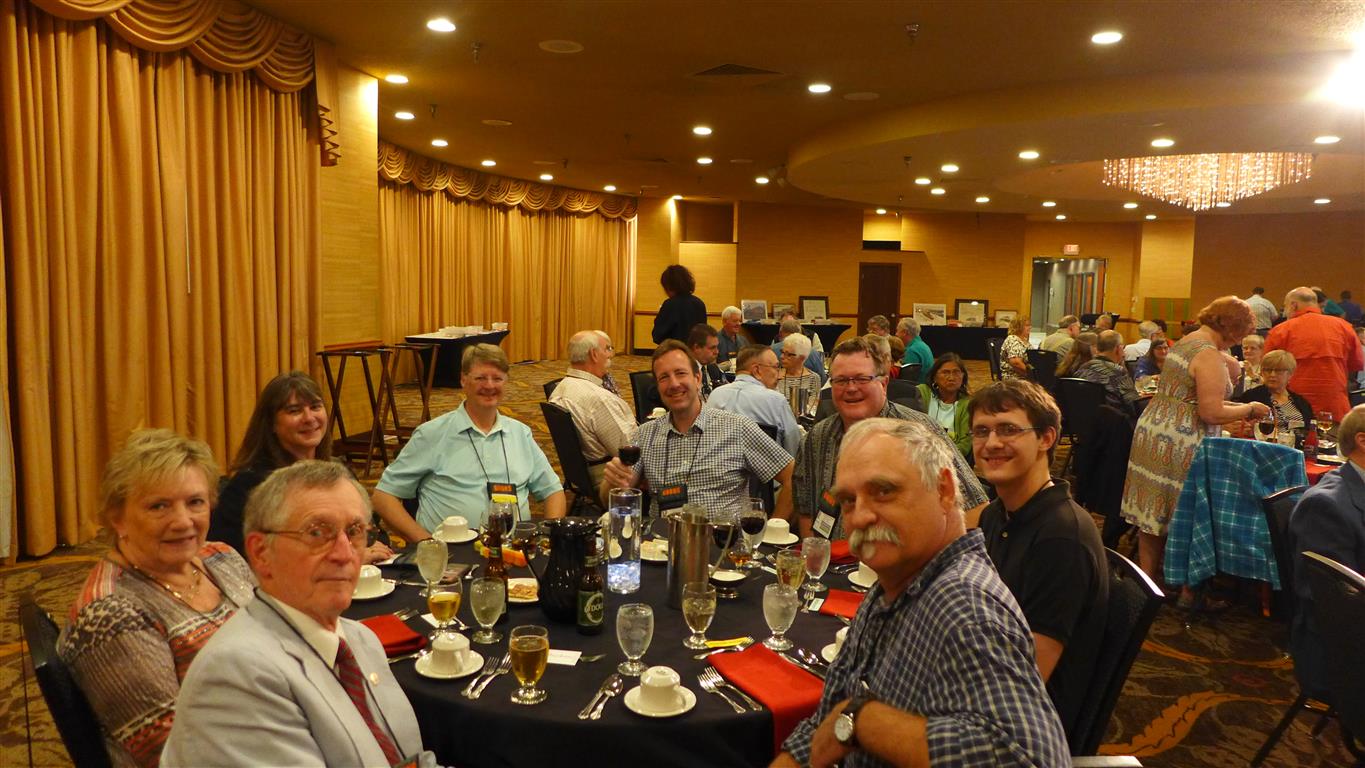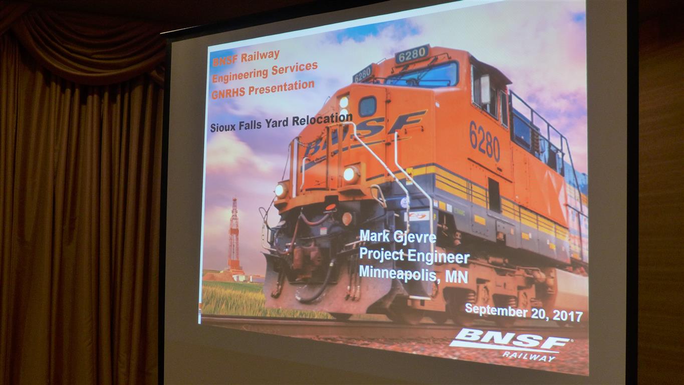 videohub: Tom Carr, Neva and Don Pavia are on the local committee putting on next year’s September 2018 Bellingham, WA convention. Mary McGlothlin makes some announcements and introduces our banquet speaker, Mark Gjevre of BNSF. GNRHS tech support guru, Luke Neumann, gives the laptop a quick reboot as Mr. Gjevre, Jeff Otto and Bob Kelly look on. Love that Omaha Orange on the BNSF PowerPoint!