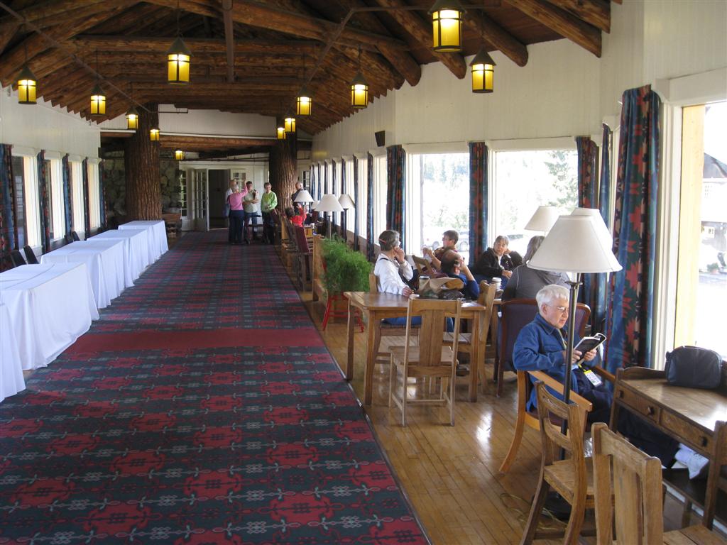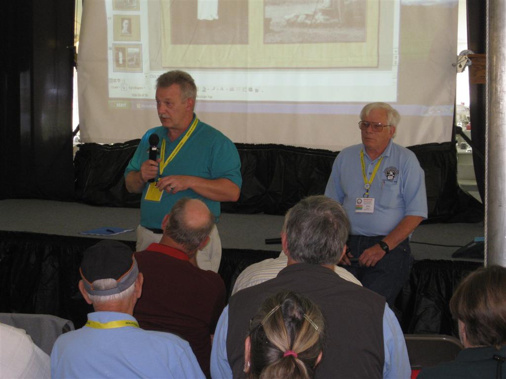 GNRHS Railfair (Swap Meet) continued: #1 - Pictures of completed GN Section House kit; #2 - close up of kit; #3 - GN caboose kit produced by PC&F; #4 - additional kits for sale; #5 - 1963 Ford Pickup used by GN for sale. Red Jammer Buses: #1 - Lining up for a Jammer Bus tour; #2 - Off goes the Jammer; #3 - Room for one more; #4 - Jammer and Lodge; #5 - A stretch Jammer. Inside the Glacier Park depot: #1 - Plaque tribute to John and Myron Chase; #2 - Rocky says...; #3 - Board display inside depot; #4 - Flowers on the GN; Views around the Lodge: #1 & #2 - Louis Hill sure picked a great spot for the Lodge; #3 - Inside hallway from Lodge to Annex; #4 - 1933 Glacier Park benchmark (in sidewalk near main door). Afternoon Presentations: #1 - Ray Djuff "The Mystery of Two Guns White Calf"; #2 - Ray Djuff answering questions; #3 - Billie Young and Eileen McCormack talk about their new book on Louis Warren Hill (The Dutiful Son); The Hobo Cookout (evening dinner): #1 - Hugh Grinnell; Joel McCurry and Doug Dederick; #2 - Peggy and Tom Arms (waving); #3 - Another table of folks; #4 - John Tracy tells us we can go eat now!; #5 - more smiling faces. #6 - Bruce Barsness and Duane Sebelius; #7 - Steve Leach smiles for the camera; #8 - Food, glorious food!; #9 - Anne and Jack Porzig getting some chow. Twilight Views: #1 & #2 - The westbound Empire Builder arrives at the depot; #3, #4, #5 - Welcome banner and convention mug designed by Member Kris Werner and Tag-Up; #6 - Welcome banner with Andy Kern and Bruce Goeser display. |