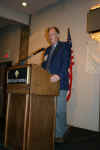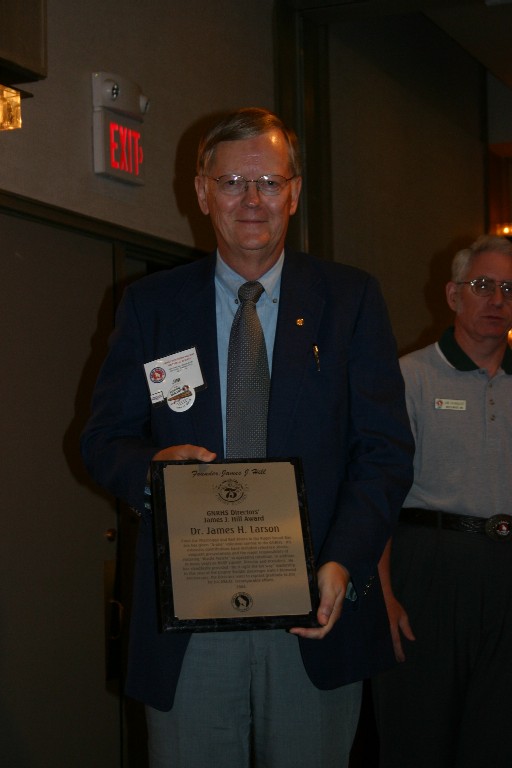 Wednesday evening banquet: #1 is President Larson opening the evening's festivities; #2 is the buffet line; #3 is folks listening to our banquet speaker; #4 is Henry Ewert talking about GN's "Third Main Line" (from Spokane to Vancouver via Molson). #1 is Norm Priebe receiving Casey Adams award; #2 is group shot of Board Members; #3 is President Larson receiving his "GNRHS Directors' James J. Hill award"; #4 is Bill Sornsin showing Chris Tanner who just won that book (door prize). #1 is Dave Durfee winning the Age Before Beauty framed print; #2 is Noel Holley winning the brass full length dome car (to be custom painted by Duane Buck); #3 is Cliff Salmon winning a two night stay at the Izaak Walton Inn; #4 is Steve Leach, Scott Tanner and Jim Larson with our huge 75th anniversary Empire Builder display (courtesy of Steve Leach, Amtrak and WSDOT). |